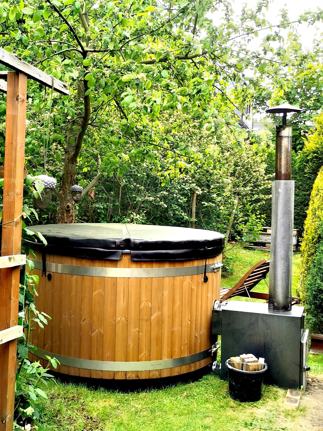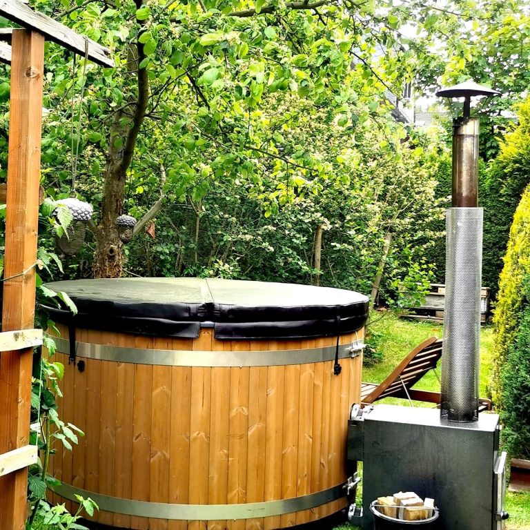 Inmitten meines Gartens steht ein großer, beheizbarer Badezuber.